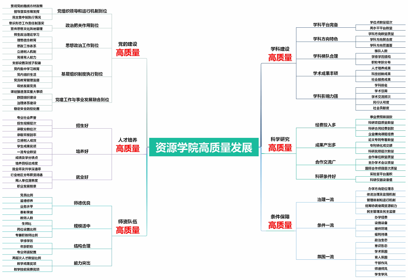 对标学科评估、专业认证、“双一流”建设指标,聚焦“资源学院高质量发展”核心任务,围绕学院党的建设、学科建设、人才培养、科学研究、师资队伍、条件保障等重点工作,用6个高质量、20余项任务以及近百项指标构建了资源学院