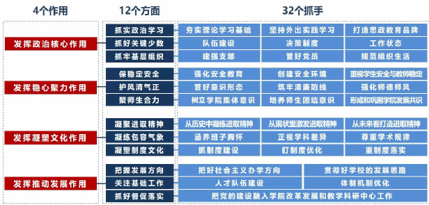以“围绕发展抓党建、抓好党建促发展”为工作理念,结合学院办学实际和发展现状,形成了“强核心、保稳定、塑文化、促发展”的党建工作思路,构建了“4+12”党建工作体系,即以政治核心、稳心聚力、凝塑文化、推动发展4个作用发挥为着力点,聚焦12个方面重点任务,抓实32项具体工作。