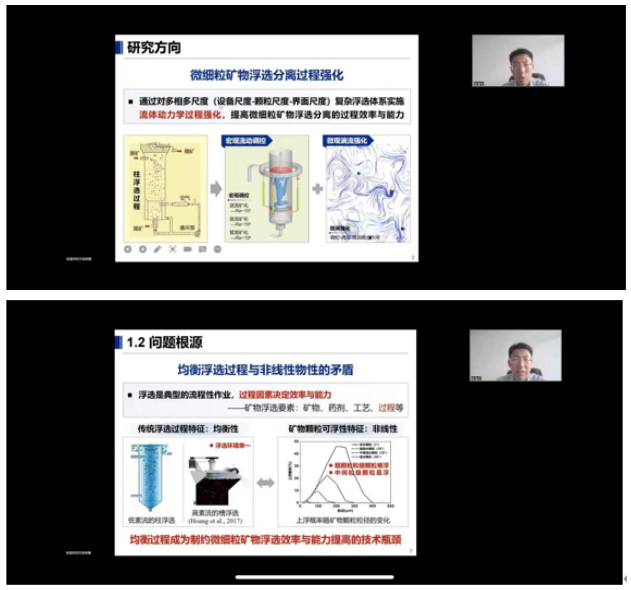 张老师围绕“微细粒矿物浮选分离过程强化的思考及工作进展”这一主题展开讲述,通过深刻剖析微细粒矿物浮选回收难的工程实际问题,总结出了均衡浮选过程与非线性物性的矛盾和微细粒与气泡高效碰撞难的问题根源,从湍流小尺度涡直接作用于颗粒运动的科学认知进行分析,来解决非均衡浮选分离过程湍流强化作用机理及调控的科学问题。张老师同时从浮选体系湍流涡能量作用机理、浮选过程湍流涡诱导与控制方法、非均衡涡流浮选分离过程强化这三个方面展开了详细论述,阐明了微涡强化微粒与微泡运动作用机制,提出了颗粒尺度涡的物理诱导与控制方法和跨尺度涡流环境构建及调控方法,建立了与非线性物性适配的非均衡浮选过程,开发了非均衡涡流浮选调浆过程强化技术和非均衡涡流浮选分离过程强化技术。最后,张老师从知识层面、方法层面、技术层面、工程层面四个方面对本次讲座进行了全面总结。